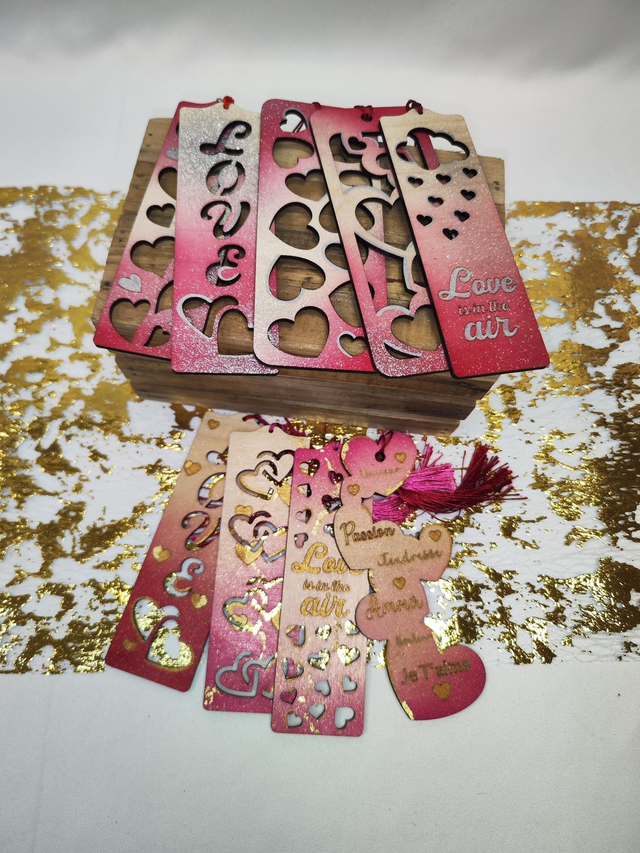 Marques pages Amour en bois. Laissez-vous séduire par ces marques pages en bois, décorés d'un motif amour. Ils vous permettront de retrouver facilement votre page tout en ajoutant une touche d'amour à vos lectures.