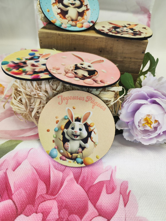 Sous-tasses sublimées ornées d'un motif lapin de Pâques aux couleurs éclatantes. La technique de sublimation garantit une adhérence optimale et une durabilité exceptionnelle face aux liquides et aux frottements répétés. Ces accessoires protègent vos surfaces tout en ajoutant une touche festive à votre table. Parfaits pour les services à thé ou à café, ils complètent élégamment votre vaisselle pascale. Résistants et faciles d'entretien, ils conservent leur brillance au fil du temps. Un ensemble incontournable pour les amateurs de décoration coordonnée et de détails raffinés.