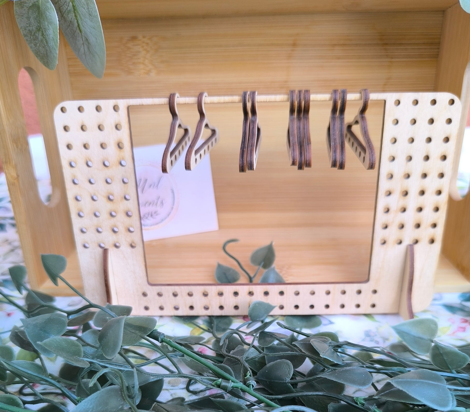 Présentoir élégant en bois conçu pour organiser vos bijoux avec précision. Équipé de mini cintres fonctionnels, ce porte-bijoux permet un rangement optimal de vos colliers, bracelets et boucles d'oreilles tout en prévenant l'emmêlement. Sa conception en bois naturel s'intègre harmonieusement à tout décor.